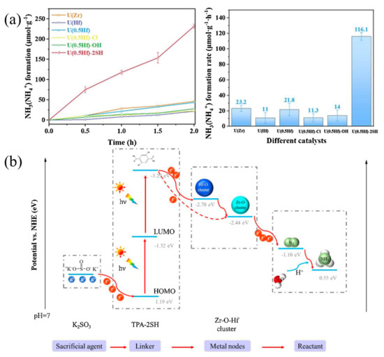 (a) Photocatalytic NH3 yield of different MOFs. (b) Photocatalytic nitrogen fixation mechanism of U(0.5Hf)-2SH. Reproduced with permission [90]. Copyright 2021, Elsevier.