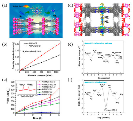 The post-transition metals can not only function as active sites as in Gd-IHEP-8, but they also act as metal nodes that impart high framework stability to MOFs. Recently, Shang et al. developed two porphyrin-based metal–organic frameworks for photocatalytic nitrogen fixation, named Al-PMOF and Al-PMOF(Fe). Compared with Al-PMOF, Al-PMOF(Fe) not only has Al as the metal node to stabilize the framework of the MOF, but also has Fe as the active center to adsorb and reduce the N2 to NH3 [87]. The structure of Al-PMOF(Fe) is shown in Figure 8a. The atomically isolated Fe in Al-PMOF(Fe) was proven through X-ray absorption spectroscopy (XAS) and X-ray photoelectron spectroscopy (XPS). Photocatalytic nitrogen fixation experiments showed that Al-PMOF(Fe) had better activity than Al-PMOF under visible light, and that the produced NH3 originated from N2. It was confirmed that the addition of Fe as the active center effectively increased the adsorption of N2 and further enhanced the photocatalytic performance (Figure 8b,c). DFT calculations were further applied to establish the photocatalytic nitrogen fixation reaction pathway (Figure 8d–f). The first hydrogenation from N2* to N2H* showed no obvious difference between alternating and distal pathways, but further hydrogenation showed that the alternating pathway seemed more likely to occur. Notably, the release of 1NH3 in the distal process requires significant energy, making the reaction difficult.