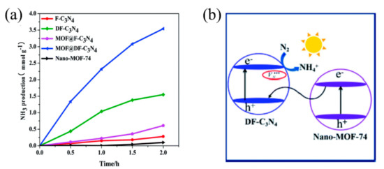 (a) The graph of NH3 yield for F-C3N4, DF-C3N4, MOF@F-C3N4, MOF@DF-C3N4, and Nano-MOF-74 under visible light. (b) Z-type heterojunction of MOF@DF-C3N4. Reproduced with permission [94].