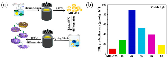 (a) Synthesis diagram of MIL-125 and MIL-125@TiO2. (b) The photocatalytic nitrogen fixation efficiency of MIL-125 and MIL-125@TiO2 under visible light irradiation. Reproduced with permission [95]. Copyright 2022, Elsevier.