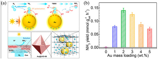MOFs can also function as porous scaffolds to support functional units, and enhance the mass transfer of N2 to produce NH3. For example, Chen et al. used the UiO-66 membrane as a nanoreactor to support gold nanoparticles (AuNPs) [93] and realized a direct plasma photocatalytic nitrogen reduction reaction at room temperature and ordinary pressure. Notably, in the Au@UiO-66, UiO-66 not only effectively restricts the highly dispersed AuNPs but also ensures effective contact between AuNPs and N2 molecules in the aqueous solvent. In the gas film solution reaction interface, the N2 molecule can proceed straight into the Au@UiO-66 membrane. Each AuNP in UiO-66 could not only generate electrons through photo-excitation, but also promote the reduction of N2 as a co-catalyst. (Figure 11a). The mass loading of gold was the critical factor that affected photocatalytic nitrogen fixation. When the loading amount of Au is 1.9 wt %, the conversion of nitrogen to ammonia reaches its highest level of 0.14 mmol g−1 h−1 (Figure 11b).
