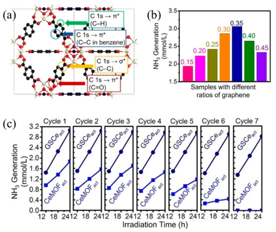 The introduced functional materials into MOFs can increase the photocatalytic nitrogen fixation activity and enhance the stability of composite materials. For example. Pan et al. reported on a graphene-embedded Ce-based UiO-66 photocatalyst (GSCe) [96]. With ultraviolet light irradiation, a breakage of benzene-C bonds inside Ce-UiO-66 formed active sites, which was evidenced by C K-edge X-ray absorption near its edge structure (reduced of C 1s → σ* at 292.0 eV) (Figure 12a). Even if the introduced graphene did not have any active sites, it could help control the activation process and hence stabilize the entire photocatalyst structure. With a graphene ratio of 0.35, GSCe reached its best performance, with a rate and apparent quantum efficiency (AQE) of 110.24 μmolL−1 h−1 and 9.25%, respectively (Figure 12b). The stability of GSCe even reached 7 × 24 h (Figure 12c).