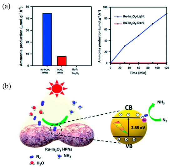 (a) The photocatalytic NH3 formation rate of different photocatalysts under visible light. (b) Mechanism of photocatalytic nitrogen fixation on Ru-In3O3 HPNs. Reproduced with permission [98]. Copyright 2021, Royal Society of Chemistry.