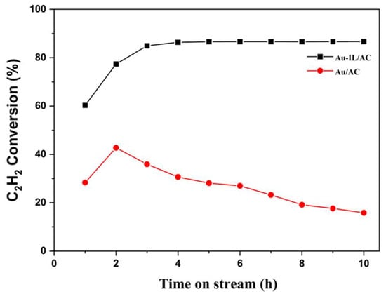 The Au-IL/AC and Au/AC catalysts were tested at the temperature of 463 K for 10 h with a 1,2-feed mole ratio of HCl to C2H2. The activity of the catalysts and the selectivity of VCM were in good agreement with our previous reports [24,25]. During the test time of 10 h on stream, the C2H2 conversion of the Au-IL/AC catalyst remained unchanged, as shown in Figure 1, which implied that the addition of ionic liquid (IL) not only caused the higher activity of C2H2 but also accelerated the reaction at the initial stage of the reaction. It should be highlighted that for both Au-based catalysts, the selectivity for the formation of VCM was above 99.8%, corroborating the performance of a typical Au system catalyst in this field. Hutchings mentioned that the induction period for Au−based catalysts was allotted to the redox coupling of the Au3+/Au+ sites [1]. Our recent results have shown that the ultra-high Au3+/Au+ contents in the Au-SILP system should be a necessary factor for its high activity compared with reference Au/C [25]. However, the kinetic effect on catalytic performance should not be ignored when the Au species is confined in IL film, which is lacking in the existing IL catalytic system.