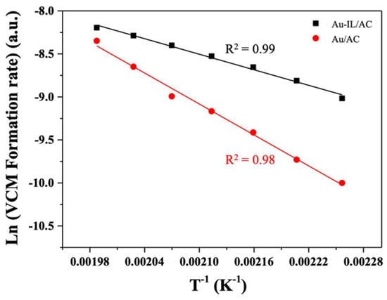 To intuitively compare the catalytic activity of the Au-IL/AC and Au/AC catalysts, as well as to further study the relationship between the ionic liquid and the active center, the activation energy (Ea), rather than turnover frequencies (TOFs), has been selected for measurement [33]. It is due to the fact that a suitable method has not been identified to accurately calculate the active sites on the Au-IL and Au/AC catalysts. To determine the values of Ea over Au-IL/AC and Au/AC, respectively, the VCM formation rate (R) was measured as a function of temperature (T) in the range of 443.15–493.15 K under ambient pressure with the HCl/C2H2 molar ratio of 1.2 [28,32]. The kinetic parameters of Ea were calculated based on the Arrhenius plots (ln(R) versus 1/T) for the Au-IL/AC (black line) and Au/AC (red line) catalysts, shown in Figure 2. The straight line indicates that the mass transfer limitations were negligible [33], which verified that the reaction was kinetics-controlled under the above conditions. A relatively steeper slope was observed for the Au/AC catalyst, corresponding to Ea-Au/AC = 50 kJ/mol. By contrast, the Au-IL/AC catalyst significantly promoted the acetylene hydrochlorination reaction with Ea-Au-IL/AC = 26 kJ/mol.