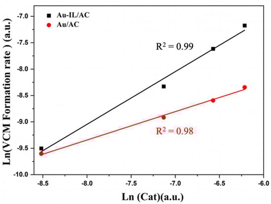 As shown in Figure 1, the addition of ionic liquid plays a dramatic promotion role in both the activity and stability of the catalyst, with a C2H2 conversion increase of 30–70% during the entire evaluation time. As previously stated, the catalytic activity depends on the number of active sites [24]. We conjectured that the addition of ionic liquid may have a positive influence on the number of active surface sites. Thus, the above hypothesis was validated by determining the reaction order to the concentration of the catalyst. As shown in Figure 3, lnR was plotted against ln[Cat.] ([Cat.]: concentration of catalyst). For the Au/AC catalyst, the linear fitting was 0.5. According to the literature, a 0.5 catalyst order implies that a fast equilibrium between the Au dimer and the active Au monomer [37,38] exists on the surface of the Au/AC catalyst. The Au monomer has been determined as the active site for acetylene hydrochlorination [1,2,3]. For the typical Au/AC, it has been confirmed that the Au dimer exists without the participation of IL [1]. Similar results have been proven in other catalytic reactions, such as the Fe-catalyzed allylic amination of olefins [39], Ir-catalyzed borrowing-hydrogen processes [40], Rh-catalyzed selective partial hydrogenation of alkynes [41], Pd-catalyzed arene C-H acetoxylation [42], and Cu-catalyzed phosphodiester hydrolysis [43], demonstrating that an equilibrium between the active monomer species and its dimer species exists.