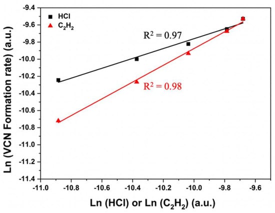 The kinetic reaction orders for C2H2 and HCl with respect to the formation rate of VCM were determined under the following reaction conditions: 463K, 16.8 mL/min HCl, and the molar ratio of C2H2/HCl was adjusted from 0.3, 0.5, 0.7, 0.9 to 1.0. The value of n(C2H2) for Au-IL/AC was calculated according to the slope, which can be easily obtained from the lnR-ln (C2H2) relationship (Figure 4). The reaction order of C2H2 over Au-IL/AC was 1, corroborating the reaction mechanism proven in previous literature [32]: the reaction process is triggered by C2H2 adsorption [1,2,44]. Measuring the reaction order to HCl, all reaction factors except the molar ratio of HCl/C2H2 were kept constant. The molar ratio of HCl/C2H2 varied from 0.3 to 1.0. The reaction order of HCl, n(HCl), was 0.5 over the Au-IL/AC system, which was different from C2H2.