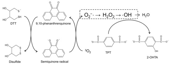 Production of O2−· by the reaction of certain redox-active substances with DTT and the measurement of ·OH production potential using TPT. Herein, 9,10-phenanthrenequine is shown as an example of a typical redox-active substance in PM2.5.