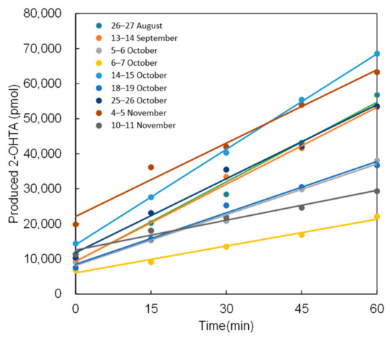 Changes in the amount of produced 2-OHTA with time upon applying the FIA-TPT assay to the PM2.5 samples collected in Kanagawa, Japan, from August to November 2021 (chart legend: sampling date).