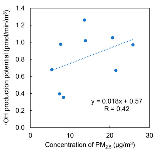 Figure 3 shows the scattered diagram of the ·OH production potentials and PM2.5 concentrations in Kanagawa. The diagram suggests no apparent relationship between the two variables (Pearson’s correlation coefficient, r = 0.42, p = 0.26); thus, the ·OH production potential does not depend on the level of PM2.5. We then focused on the carbonaceous components of PM2.5, which mainly consist of organic carbon (OC) and elemental carbon (EC) [34,35]. The constituents of OC mostly consist of organic compounds, including PAH quinones, which volatilize under heating in an inert atmosphere. On the other hand, EC contains graphitic carbon, which can only be converted into gas by oxidation at high temperatures. Thus, OC/EC analysis was performed for nine PM2.5. The results showed that the mean OC and EC concentrations were 2.6 ± 0.93 µg/m3 and 0.39 ± 0.18 µg/m3, respectively. Cheng et al. [32] reported that the ·OH production potential of PM2.5 in Hong Kong significantly correlates with OC concentrations but not with EC concentrations. In contrast, the ·OH production potential in this study showed significant correlations with both OC (r = 0.68, p < 0.05) and EC (r = 0.69, p < 0.05) concentrations. However, the mean OC concentration was seven times higher than that of EC. This indicates that the ·OH production potential of PM2.5 at the Kanagawa site was mostly attributed to organic aerosols.