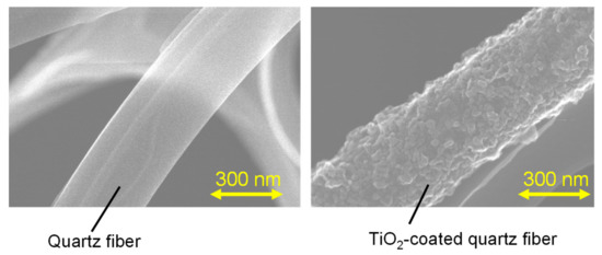 Figure 4 shows images of the quartz filter before and after depositing TiO2, observed by a field-emission scanning electron microscope (FE-SEM). The TiO2 layer was formed on the surface of the quartz fiber without constant morphology, and its crystalline structure was identified as anatase using an X-ray diffraction (XRD) analysis as shown in Figure 5. The amount of TiO2 supported on the quartz filter was 0.049 ± 0.0011 g (n = 5). Simultaneous sampling of PM2.5 was conducted using two co-located high-volume air samplers with TiO2 and quartz (non-TiO2 coated) filters. Concentrations of PM2.5 collected on the TiO2 and quartz filters were 7.9 ± 4.0 µg/m3 (n = 5) and 8.0 ± 4.2 µg/m3 (n = 5), respectively, and no significant difference in the collection amount of PM2.5 between the two filters was found.