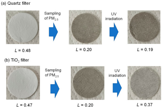 As shown in Figure 6, the color of the collection filters was originally white, with a relative luminance (L) of 0.48 for the quartz filter and 0.47 for the TiO2 filter. After trapping PM2.5, the color turned black with a relative luminance of 0.20, partly owing to the carbonaceous components in PM2.5. Subsequently, UV irradiation was performed for both the PM2.5 samples. After UV irradiation for 24 h, no remarkable change in the color was observed for PM2.5 collected on the quartz filter. In contrast, a remarkable color degradation from black to gray with increased relative luminance was observed for PM2.5 collected on the TiO2 filter. This visual change suggests the successful degradation of carbonaceous components in PM2.5 by this photocatalytic reaction.