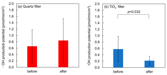 The FIA-TPP assay was applied to five pairs of the PM2.5 samples collected on the quartz and TiO2 filters before and after UV irradiation for 24 h. Since the concentration of 2-OHTA increased with time and good linearity was found for every sample with R2 ≥ 0.95, the ·OH production potentials were obtained from the slopes of the curves and air sampling volume, and the results are shown in Figure 7. No significant changes in the ·OH production potential of PM2.5 collected on the quartz filter were observed before or after UV irradiation. On the other hand, the ·OH production potential of PM2.5 on the TiO2 filter significantly reduced from 0.58 ± 0.40 pmol/(min m3) to 0.22 ± 0.13 pmol/(min m3) with a rate of 62% upon UV irradiation for 24 h (p = 0.032, paired t-test). This shows that the photocatalytic reaction of the TiO2 filter is effective in reducing the ·OH production potential of PM2.5.