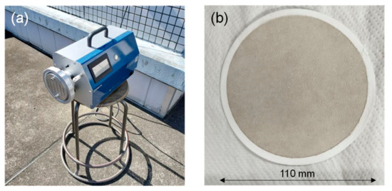 PM2.5 in the air was collected on a quartz filter (Advantec Toyo; diameter = 110 mmφ, thickness = 0.38 mm, SiO2 > 99%) using a high-volume air sampler (Shibata, Tokyo, Japan; HV-500R attached with a particle size selector for PM2.5). It was collected at a flow rate of 500 L/min for 24 h at the roof of the school building of Tokai University, Kanagawa, Japan (35°21′42.4″ N, 139°16′29.0″ E, approximately 20 m above the ground). Figure 8 shows the high-volume air samplers used and the typical appearance of PM2.5 collected on the quartz filter. Sampling was conducted from August to November 2021. Before and after sampling, the filters were conditioned for more than 24 h under constant temperature (21 °C) and relative humidity (40 ± 4%), and, thereafter, the weight of the filter was measured using a microbalance (Shimadzu, Kyoto, Japan; ATX224). The concentration of PM2.5 was determined from the weight difference and total sampling volume of air.