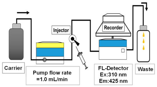 The TPT assay described by Xiong et al. [31] was used for the evaluation of the ·OH production potential of PM2.5 with a minor modification; that is, FIA was applied to the assay. In our previous study [30], FIA was successfully applied to the DTT assay for the easy handling of photodegradable reagents and rapid measurement. The FIA system for the TPP assay was established based on a previous study, as shown in Figure 9. The system consisted of a reservoir of carrier solution, an L-6000 isocratic pump (Hitachi, Tokyo, Japan), an injector (IDEX Health & Science, Rohnert Park, CA, United States; 7725 Sample Injector), an RF-20A fluorescence detector, a C-R6A recorder (Shimadzu), and a waste bottle.