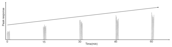 Linear increase in the peak response of 2-OHTA produced in the PM2.5 sample (Sampling date: 6–7 October 2021). For one analysis, five repeated injections were performed within 90 s.