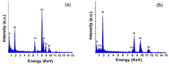 To characterize and identify the composing elements in the WO3 NW@Fe2O3 and WO3 NW@CuO nanocomposites, EDS analysis was performed. Figure 2a,b show the EDS spectra and confirm the presence of oxygen (O), tungsten (W), iron (Fe) and copper (Cu). These signals originated from the WO3 NW, and Fe2O3 and CuO in the nanocomposites, while the Cu peak—in the case of the WO3 NW@Fe2O3 nanocomposite sample—originated from the sample holder (Cu grid).