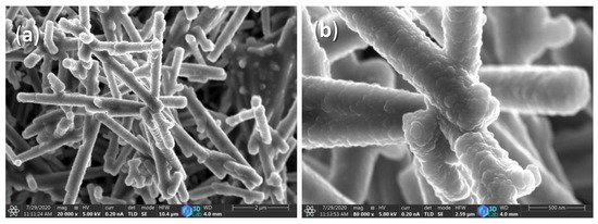 To study the surface morphology of the produced WO3 NW@Fe2O3/cellulose and WO3 NW@CuO/cellulose hybrid membranes, SEM analyses were performed. The morphology of the unmodified WO3 NW (Figure 3a,b), the as-prepared WO3/cellulose (Figure 4a,b), WO3 NWs@Fe2O3/cellulose (Figure 4c,d) and WO3 NWs@CuO/cellulose hybrid membrane (Figure 4e,f) were investigated.