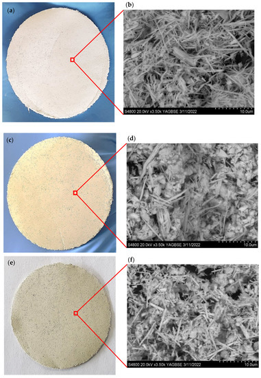 In the SEM images shown in Figure 3a,b, the average diameter of the WO3 nanowires is 100–120 nm. The photographs in Figure 4a,c,e show the produced self-supported membranes, while the SEM images in Figure 4b,d,f demonstrate the microstructure of the WO3 NW/cellulose (Figure 4b), WO3 NWs@Fe2O3/cellulose (Figure 4d), and WO3 NWs@CuO/cellulose (Figure 4f) hybrid materials. For the WO3 NWs@CuO/cellulose membrane, an increased pore size was observed due to the smaller individual particle size of the CuO nanoparticles.