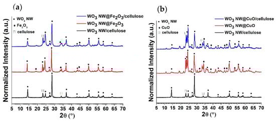 XRD of WO3 NW@Fe2O3/cellulose (a), and WO3 NW@CuO/cellulose (b) hybrid membranes.