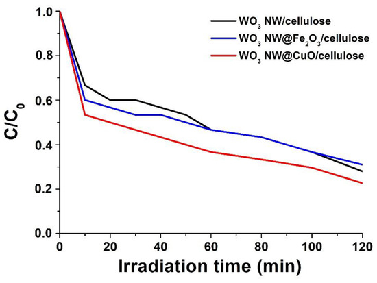 Photocatalytic performance of WO3 NW/cellulose (black curve), WO3 NW@Fe2O3/cellulose (blue curve), and WO3 NW@CuO/cellulose (red curve) hybrid membranes in MB degradation reaction.