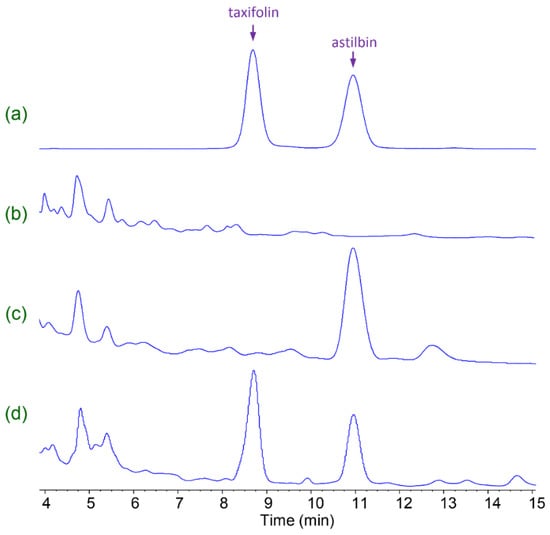 High-performance liquid chromatography (HPLC) analysis of taxifolin and astilbin. (a) Standard taxifolin and astilbin dissolved in methanol; (b) Extract of SQH4 culture medium without added astilbin; (c) Extract of SQH2 culture medium, after incubation with 1 g/L astilbin; (d) Extract of SQH4 culture medium, after incubation with 1 g/L astilbin. Biotransformation was performed at 30 °C, pH 4.5, shaking at 200 r/min for 8 h.