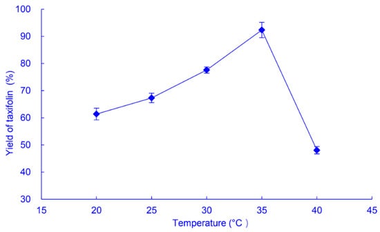 Effects of temperature on the yield of taxifolin from biotransformation of astilbin by A. fumigatus SQH4. Biotransformation was performed at pH 6.5 with shaking at 200 r/min for 8 h, with 1 g/L astilbin.