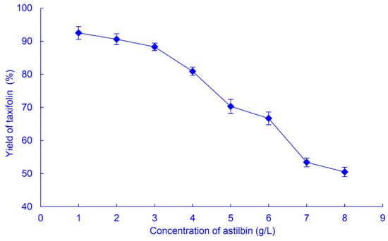 The yield of taxifolin from biotransformation of astilbin at different concentrations by A. fumigatus SQH4. Biotransformation was performed at 35 °C, pH 6.5, with shaking at 200 r/min for 8 h.
