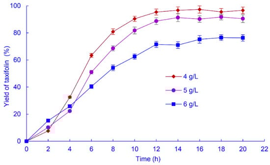 Prolonging the biotransformation time can improve the yield of products. However, excessive time may result in bacterial spoilage and degradation of the reaction products, so the time must be optimized to maximize the yield. The effect of biotransformation time on the taxifolin yield was determined with 4, 5, and 6 g/L astilbin (Figure 6).