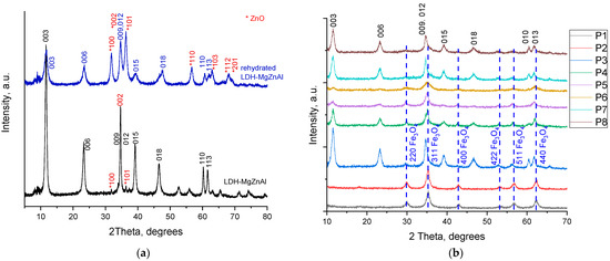 As previously reported [40], the X-ray diffractogram of the bare LDH shows (Figure 1a), at low angles, narrow and intense diffraction lines and, at high diffraction angles, wide and less intense lines characteristic of the LDH materials [41]. In addition to these lines, additional lines corresponding to the zincite phase (ZnO) appeared, as minor impurities, in the 2 theta range 31–38° [40]. The reconstruction by memory effect occurred with the preservation of the lines of the stable ZnO phase (ICDD 005-0664).