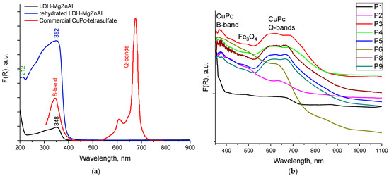 The bare LDH showed a wide absorption band in the range of 240–380 nm, with maxima at 348 and 359 nm corresponding to a zincite phase in the layered structure (Figure 2a) [40]. The additional band at 212 nm corresponds to Mg(OH)2/MgO [40,46], while those in the region 550–750 nm to the strong Q bands, assigned to the CuPc [47]. The DR-UV-Vis spectra of the phthalocyanine-LDH composites are presented in Figure 2b. These disclose B-bands of CuPc (300–350 nm) [48] and magnetite 500 nm [49].