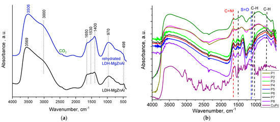 The intercalation of phthalocyanine was also confirmed by the DRIFT analysis (Figure 3). Regarding the LDH (Figure 3a), the wide absorption band located in the 3700–3400 cm−1 range corresponds to the vibrations of the OH, ν(O–H) groups in the interplanar space, while the band at 3000 cm−1 was assigned to the hydrogen bonds between the water and the carbonate anion [50]. The band at 1638–1650 cm−1 corresponded to the vibrations of the water molecules in the layered structure, that in the range 1100 and 650 cm−1 to the vibrations of the CO32− groups, and those before 600 cm−1 to the Mg-O, Zn-O and Al-O bonds. The infrared spectra also showed some bands associated with the presence of LDH-anchored phthalocyanine [51] (Figure 3b), although their intensity was very low. For example, the band at approximately 1650 cm−1 was be assigned to the C=N bond, that at 1120 cm−1 to the S=O bond, and those at 730, 1033 and 1090 cm−1 to the C-H bond.