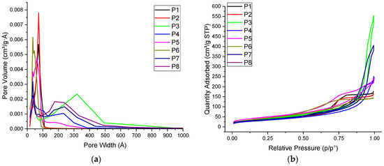 Pore-size distribution (a) and adsorption–desorption isotherms (b) for the P1–P8 catalysts.