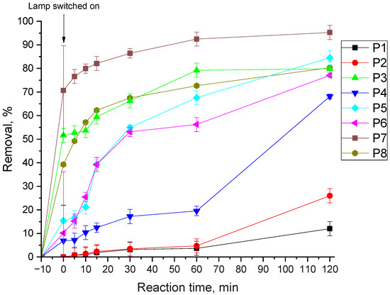 The photo-irradiation of the system changed the order established by the adsorption. However, the photo-catalytic degradation could not be separated from the adsorption of the ampicillin and degraded fragments, and it was also dependent on the photo-irradiation energy. Under the LED irradiation (the initial concentration of ampicillin in solution at t = 0), the maximum degradation was achieved for P7, with a removal of ~93% after 2 h of reaction. Overall, summarizing the effects of the adsorption and photocatalytic degradation, the removal decreased in the following order: P7 > P5 > P8~P3 > P6 > P4 > P2 > P1 (Figure 5). The performances of these catalysts depended both on the LDH:MNP ratio (which was also associated with the amount of CuPc) and the textural properties of the composite.