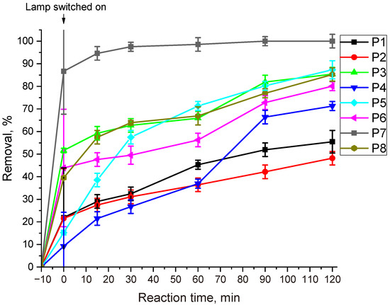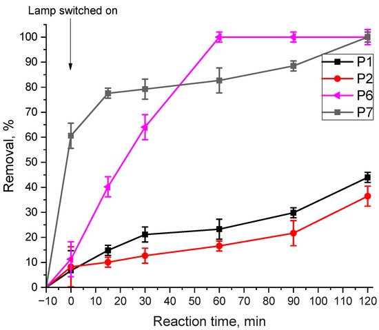 Moving to a solar simulator as an irradiation source (Figure 6) afforded a higher removal efficiency, which was correlated with the higher photocatalytic efficiency attributed to the absorption of the light via the Q bands of the phthalocyanine.