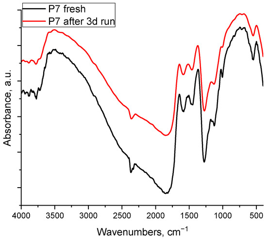 The stability and reusability of catalysts are very important factors in the characterization of their efficiency and the limits of their applicability in real applications. Based on these considerations, the composite P7 demonstrated an enhanced efficiency. After three runs (the catalyst was magnetically removed from the reaction environment, washed thoroughly with deionized water, and then dried at 120 °C for 4 h) the conversion of the ampicillin was conserved at 98%. After each run, the DRIFT analysis confirmed no leaching of the phthalocyanine (Figure 7).