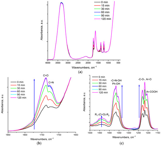 FTIR spectra of amoxicillin solution in the presence of P7 sample at each reaction time: (a) full spectra, (b) 1850–1650 cm−1 region, (c) 1500–1150 cm−1 region.