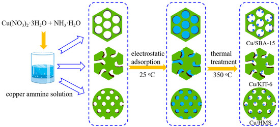 Cu nanoparticles supported on mesoporous silica were prepared by electrostatic adsorption method, based on copper ammonia solution as the precursor. The pore structure of mesoporous silica was considered to be a significant factor affecting the distribution of metal nanoparticles and catalytic behaviors, due to the effective confinement of metal nanoparticles by a mesoporous structure. Thus, three mesoporous silica supports with different pore structures named as SBA-15, KIT-6 and HMS, were selected as supports to explore the support structure effect on metal dispersion and catalytic behaviors. The schematic illustration of the catalysts’ synthesis is shown in Figure 1.