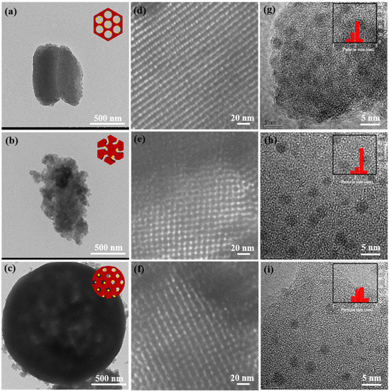 TEM images and particle size distributions of Cu nanoparticles over Cu/SBA-15, Cu/KIT-6, and Cu/HMS catalysts. (a–c) The morphologies of the catalysts; (d–f) the pore sizes of the catalysts; (g–i) the Cu nanoparticle sizes of the catalysts.