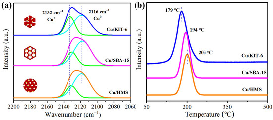 (a) In situ DRIFTS analysis of sequential adsorbed CO over Cu/KIT-6, Cu/SBA-15, and Cu/HMS catalysts; (b) H2-TPR analysis of Cu/KIT-6, Cu/SBA-15, and Cu/HMS catalysts.