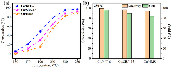 The N2 adsorption isotherms (Figure 2a) and pore size distributions (Figure 2b) of Cu/KIT-6, Cu/SBA-15, and Cu/HMS catalysts were determined by nitrogen adsorption analysis, and the textural parameters are shown in Table 1. The N2 adsorption isotherm of these catalysts all displayed type IV isotherm, proving mesoporous characteristics. The Cu/KIT-6 catalyst had an H1 type hysteresis loop ranging from 0.6 to 0.8, signifying typical mesoporous structures of uniform pore size. Well-defined and steep hysteresis loops indicated a narrow pore size distribution, which was consistent with the pore size distribution curves. While the adsorption hysteresis loop of Cu/SBA-15 was wider than that of Cu/KIT-6, a wider pore size distribution over Cu/SBA-15 was observed. The pore size distribution of SBA-15 was concentrated at ~7.17 nm, Cu/KIT-6 was concentrated at ~4.74 nm, while a narrow pore size distribution was concentrated around ~3.67 nm for Cu/HMS. The wide-angle XRD patterns of the catalysts are displayed in Figure 2c. It was difficult to find the obvious diffraction peaks of CuOx or Cu-related phase for all catalysts, which indicated that Cu nanoparticles might be uniformly dispersed over the support with small Cu nanoparticles [19]. The small-angle XRD patterns are given in Figure 2d. Cu/KIT-6 had an intense diffraction peak at 2θ ≈ 0.95° accompanied by two weak peaks at 1.10° and 1.82°, indexed as (211), (220), and (332) reflections, respectively, corresponding to the cubic three-dimensional pore structure [20]. The peaks at 0.85°, 1.48°, and 1.71° corresponded to the characteristic peaks of the (100), (110), and (200) planes of SBA-15 with a hexagonal structure, which indicated the formation of ordered mesoporous structures [21]. The XRD pattern of the Cu-HMS featured the (100) diffraction peak accompanied by broader, unresolved higher order reflections, indicating that the catalyst also possessed a mesostructure [22]. In order to determine the effect of the support nanostructure after Cu deposition, the XRD spectra of HMS and Cu/HMS were obtained, as shown in Figure S1. The results showed that there were no obvious differences between the two samples, which indicated that the introduction of Cu nanoparticles into the supports did not interfere with the structural ordering of the supports.