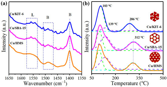 (a) In situ NH3-FTIR spectra of Cu/KIT-6, Cu/SBA-15, and Cu/HMS catalysts at 25 °C; (b) NH3-TPD analysis of Cu/KIT-6, Cu/SBA-15, and Cu/HMS catalysts.