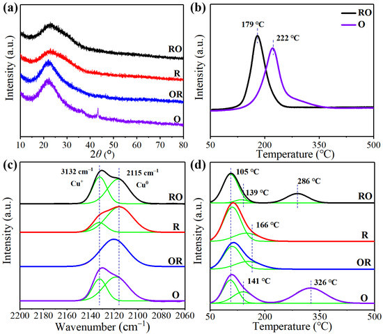 (a) Wide-angle XRD patterns, and (b) H2-TPR analysis, of the Cu/KIT-6 catalyst under different treatment atmospheres. (c) In situ DRIFTS analysis of sequential adsorbed CO over the Cu/KIT-6 catalyst, and (d) NH3-TPD analysis of the Cu/KIT-6 catalyst, under different treatment atmospheres.