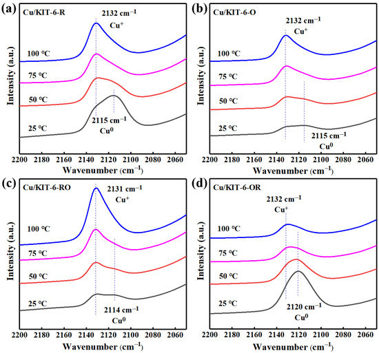 DRIFTS analysis of sequential adsorbed CO over the Cu/KIT-6 catalyst under different pre-treatment atmospheres: (a) R, (b) O, (c) RO, and (d) OR samples.