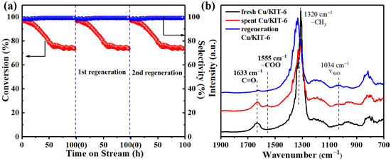 We further explored the stability and recyclability of the Cu/KIT-6 catalyst by carrying out long time-on-stream experiments at 250 °C, and the results are presented in Figure 9a. After maintaining a conversion of 96.8% for about 20 h, the ethanol dehydrogenation reaction showed a decrease in the conversion of 0.54% per hour. The ethanol conversion remained at 74.5% after running for 96 h. Surprisingly, the acetaldehyde selectivity remained above 99% after 96 h. The deactivation mechanism of the catalyst was explored by performing some characterizations on the spent catalyst. Firstly, to determine whether there was a loss of Cu nanoparticles during the reaction, atomic absorption spectrometers were performed on the reacted catalysts. The comparative experiment revealed that no clear loss of Cu nanoparticles from the catalyst occurred, which indicated the good structural stability of this catalyst. Secondly, no significant growth of the Cu particles had taken place despite the extended time-on-stream. XRD patterns (Figure S5) exhibited no obvious diffraction peaks of Cu nanoparticles, indicating uniformly dispersed and small Cu crystallites. To further explore whether a loss of activity had been caused by the metal sintering mechanism, the TEM image of the spent catalysts showed that the average size of the Cu particles was ~2.10 nm, which remained unchanged compared with the fresh catalyst without aggregation (Figure S6). These results suggested that sintering was unlikely to be responsible for the decrease in catalytic activity. It was attributed to the fact that the nanoparticles exhibited a significant anti-aggregation ability even when heated to high temperatures due to the strong interfacial interaction between Cu and mesoporous silica, and the protective effect of ammonia water on Cu nanoparticles as a ligand [45]. Moreover, another important factor that was considered, was that fouling over the active sites may have led to deactivation of the catalyst. Therefore, the spent catalyst was reused under the same reaction conditions by heating in a flow of 20% O2/N2 for 1 h at 250 °C, and surprisingly, almost recovered its high conversion (96.5%) and selectivity (99.5%). Additionally, this oxidative treatment successfully regenerated the catalyst to full activity even after three cycles. We speculated that fouling was the main cause of deactivation in our catalytic conditions. To further shed some light on the catalyst deactivation mechanism, the fresh catalyst, spent catalyst, and regenerated catalyst were characterized by in situ FTIR, as shown in Figure 9b.