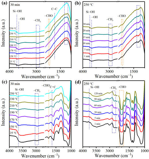 (a) In situ FTIR spectra of ethanol dehydration reaction over Cu/KIT-6 catalyst. The catalyst was exposed to ethanol atmosphere for 30 min at different temperatures followed by desorption. (b) In situ FTIR spectra of the catalyst exposed to ethanol atmosphere at 250 °C for different times. (c) In situ FTIR spectra of the catalyst exposed to acetaldehyde atmosphere for 30 min at different temperatures followed by desorption. (d) In situ FTIR spectra of the catalyst exposed to acetaldehyde atmosphere at 250 °C for different times.