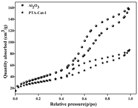 BJH pore size distribution plots and N2 adsorption–desorption isotherms of Al2O3 and PTA-Cat-I catalyst samples.