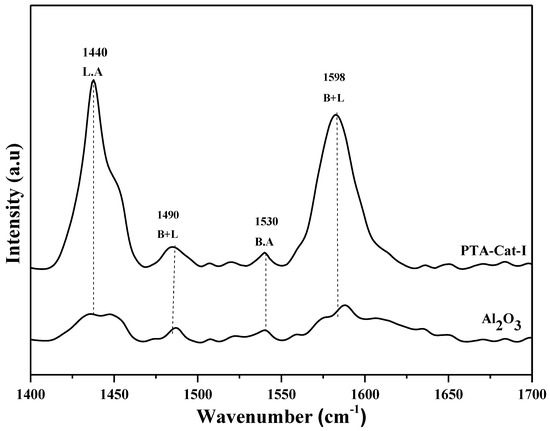 Additionally, the concentration of Lewis and Bronsted acid sites of samples was examined using the pyridine adsorption technique. Pyridine adsorption data imply (Figure 4) that alumina has very weak Lewis acidity; it was improved with the doping of phosphotungstic acid. Additionally, pyridine adsorbed peaks (e.g., 1440 and 1598 cm−1) of alumina increased after impregnation with phosphotungstic acid. The increase in peak intensity shows an increase in Lewis acidity. The low intensity of Bronsted acidity was determined from small peaks of pyridine adsorption (e.g., 1490 and 1530 cm−1). The Pd-PTA- alumina (e.g., PTA-Cat-I) possess a higher amount of Lewis acid sites over the catalyst surface in the presence of weak Bronsted acid sites. Furthermore, it was noted that bifunctional catalyst (PTA-Cat-I) normally possesses strong Lewis and weak Bronsted acid sites on the surface of the catalyst, as presented in Figure 4. In addition, the concentration of Lewis (L) and Bronsted acid sites (B) of prepared catalyst samples was calculated by pyridine adsorbed peaks [45].