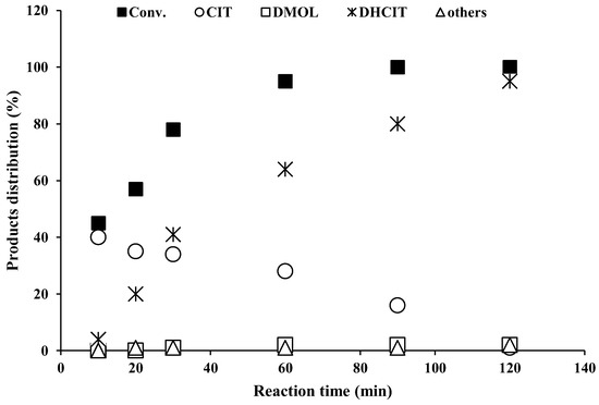 The hydrogenation of citral substrate was conducted in a stainless steel autoclave reactor under optimized conditions. The literature (Scheme 1) and experimental data suggest that synthesis of menthol through citral hydrogenation comprises three consecutive reaction steps: (a) hydrogenation of citral to citronellal (CIT); (b) cyclisation of citronellal (CIT) to isopulegol (IPOL); (c) hydrogenation of isopulegol (IPOL) to menthols (MOL). In the starting research phase, metal (e.g., Pd, Pt, Ni, Cs and Sn)-supported alumina catalysts (e.g., Cat-I (Pd-Al2O3), Cat-II (Pt-Al2O3), Cat-III (Ni-Al2O3), Cat-IV (Cs-Al2O3) and Cat-V (Sn-Al2O3) were applied in the liquid-phase citral hydrogenation reaction under optimized conditions (T = 70 °C and P = 1.0 MPa) (Table 3).