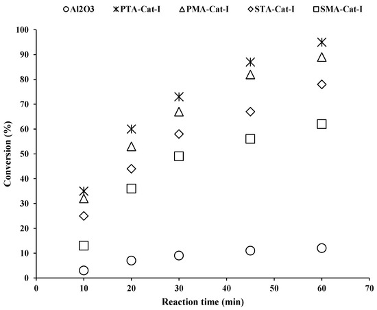 In the initial stage, ethanol-washed alumina support was tested in cyclisation reaction. Within 1 h of reaction time, alumina transformed citronellal reactant molecules (approximately 12%, lowest reaction rate 0.003 min−1) into unwanted side products. The isopulegol formation over this catalyst was negligible. It was observed that the catalytic performance of alumina was significantly improved (e.g., higher reaction rate) with (20 wt.%) impregnation of various heteropoly acids (e.g., PTA, SMA, STA and PMA). However, PTA-Al2O3 acidic catalyst exhibited the highest catalytic activity (conv. 95% and K = 0.044 min−1) and isopulegol selectivity (97%). Furthermore, PMA-Al2O3 catalyst yielded 92% isopulegol at 89% citronellal conversion (reaction rate k = 0.037 min−1) within one hour of reaction time. Additionally, STA-Al2O3 (e.g., conv. 78%, selectivity 85% and reaction rate 0.029 min−1) and SMA-Al2O3 (e.g., conv. 62%, selectivity 64% and reaction rate 0.022 min−1) catalysts were found to be less active and less selective than the PTA-Al2O3 and STA-Al2O3 catalyst samples. The reaction kinetics of all prepared catalysts is shown in Figure 5.